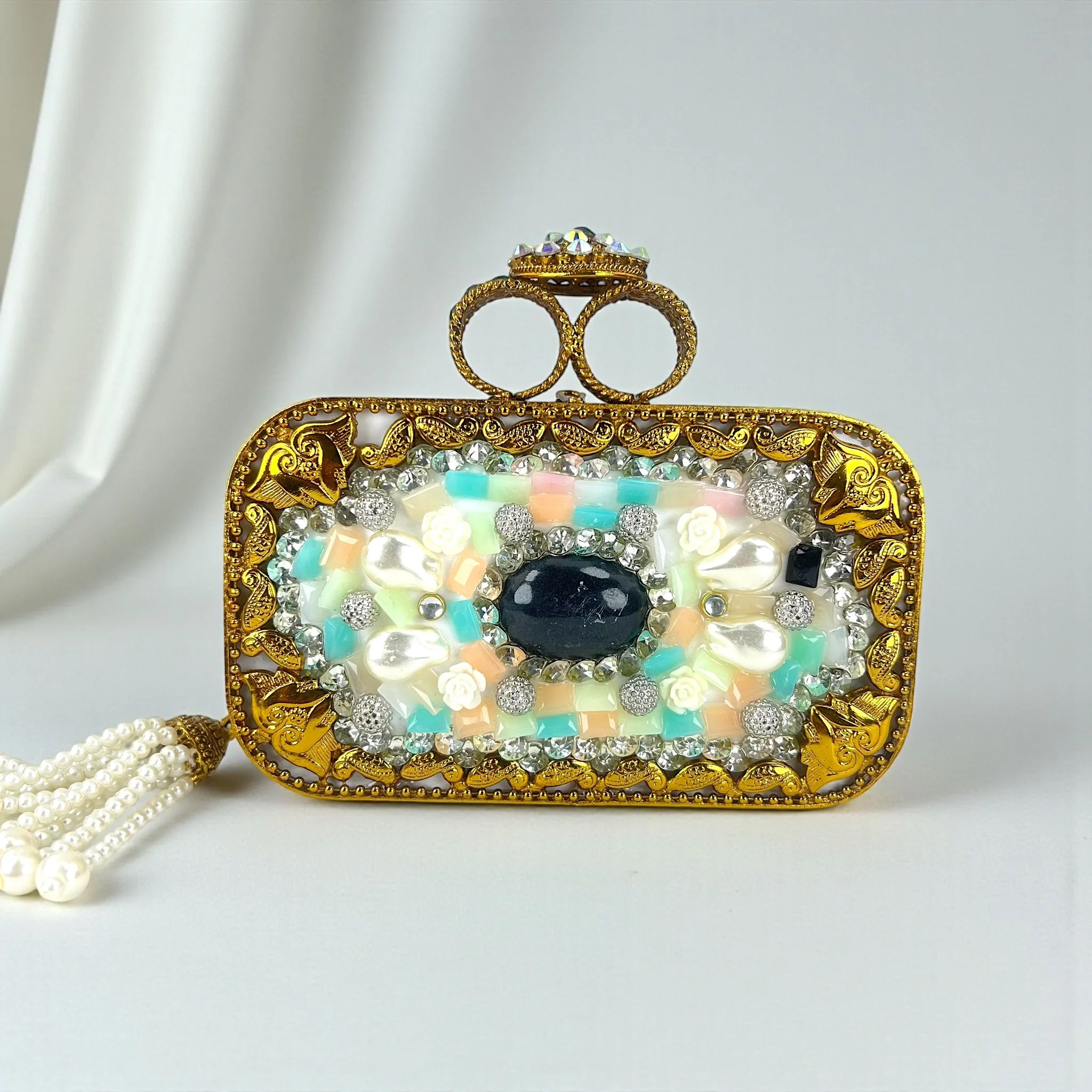 This handbag is a statement piece that blends elegance, workmanship, and classic design, making it perfect for nighttime occasions, weddings, or festive celebrations.