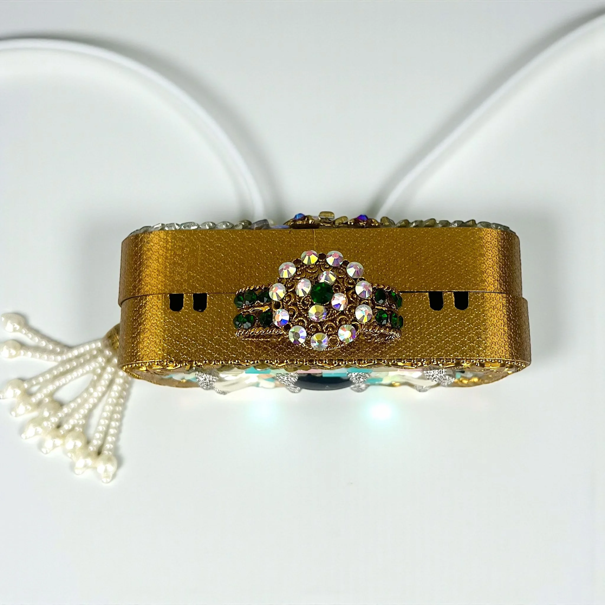 Rich, regal charm emanates from the clutch, which is framed in an opulent golden border.