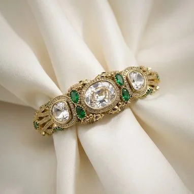 Rich green stones provide a classic splash of color throughout the design, while a cluster of sparkling white stones adorns the middle, creating a vivid focal point.