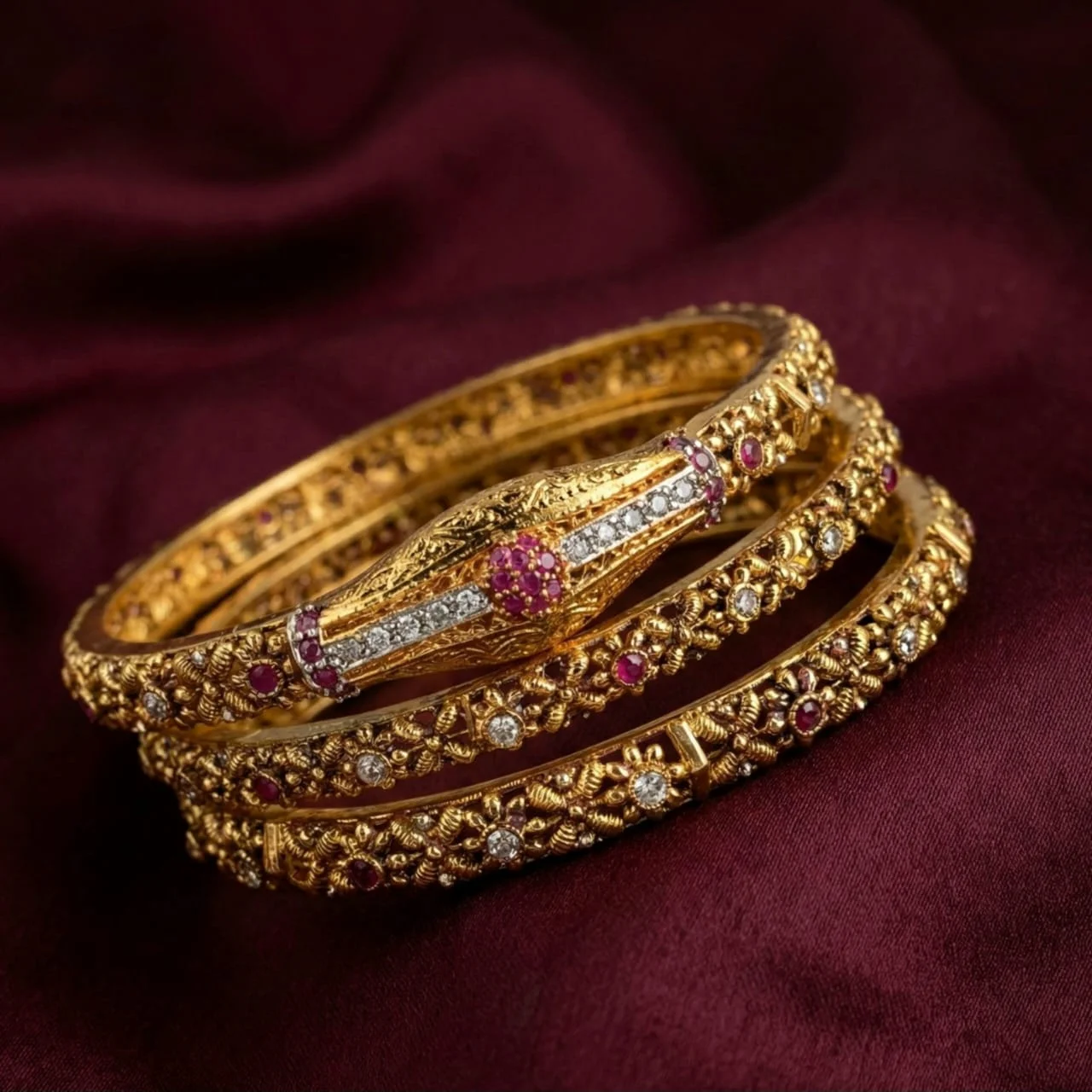 Each bangle, which has a delicate floral design and brilliant pink stones, is complemented with opulent gold-plated finishing, giving it a glowing and elegant appearance.
