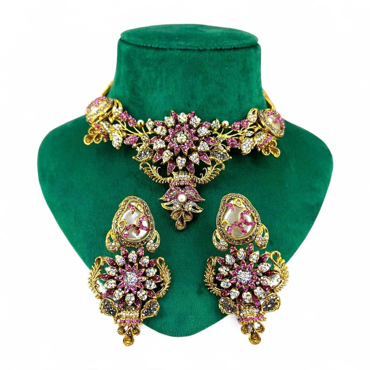 With its opulent golden frame and captivating floral design adorned with white and magenta gemstones, this set exudes a delicate yet majestic charm.