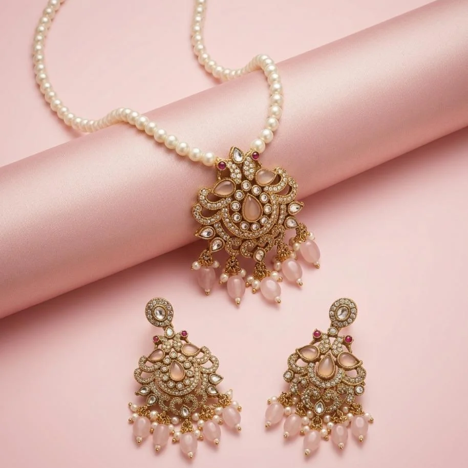 The set has a chic traditional design and is embellished with beautiful pink stones that give it a feminine charm.