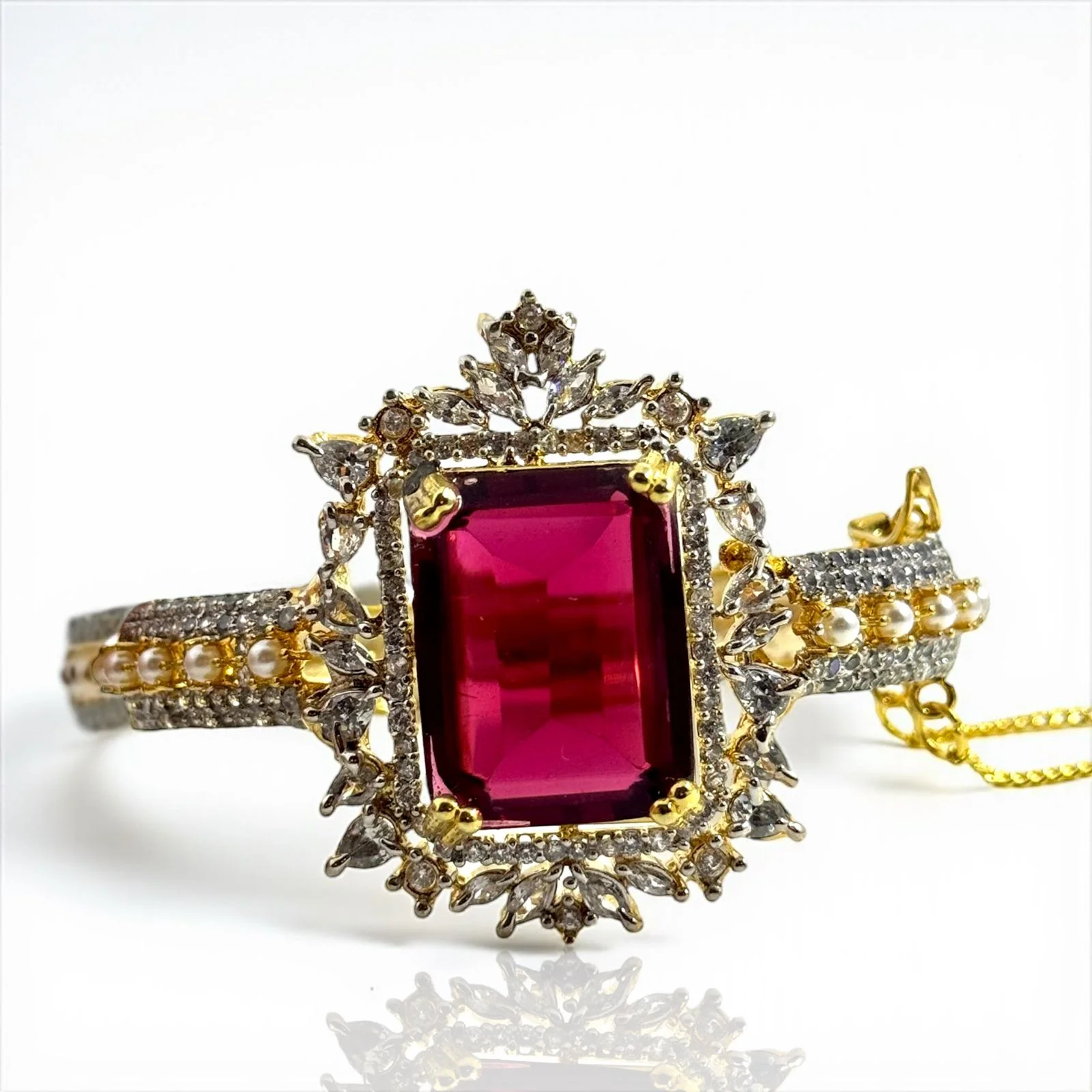 Delicate white pearls add a timeless, elegant beauty to the design. This bangle, which has an openable band that is gold-plated, is both opulent and comfortable to wear.