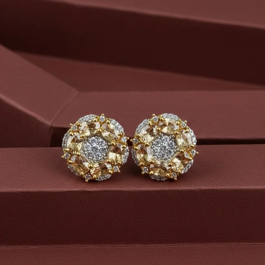 These champagne ear studs have a rich golden frame and a sophisticated flower design.