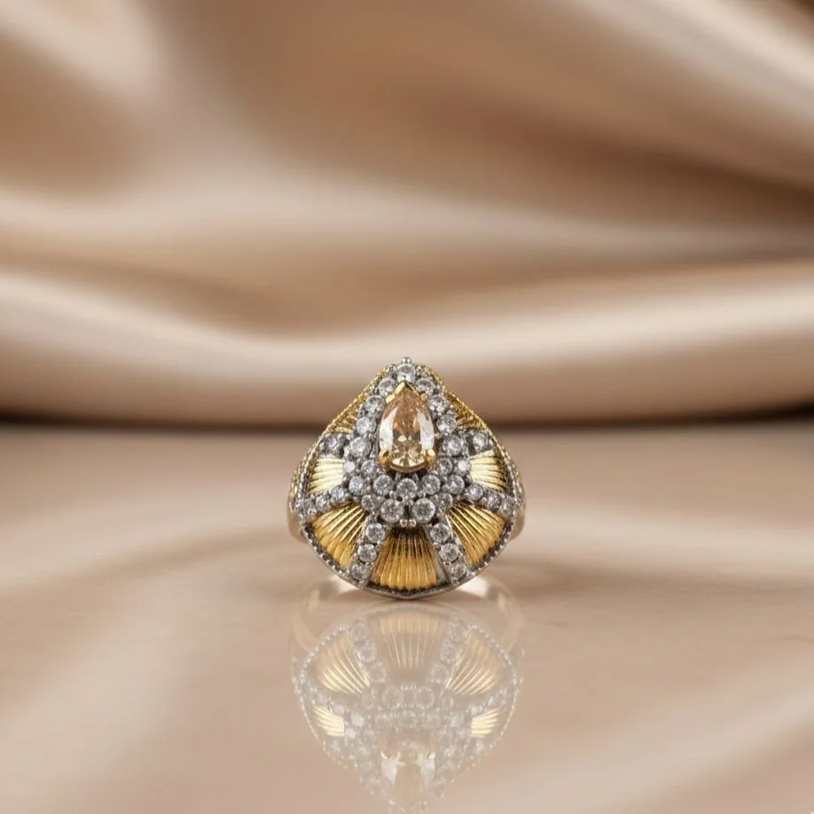 Our Champagne Ring (Size 17), exquisitely fashioned with an opulent gold-plated frame, exudes refinement.