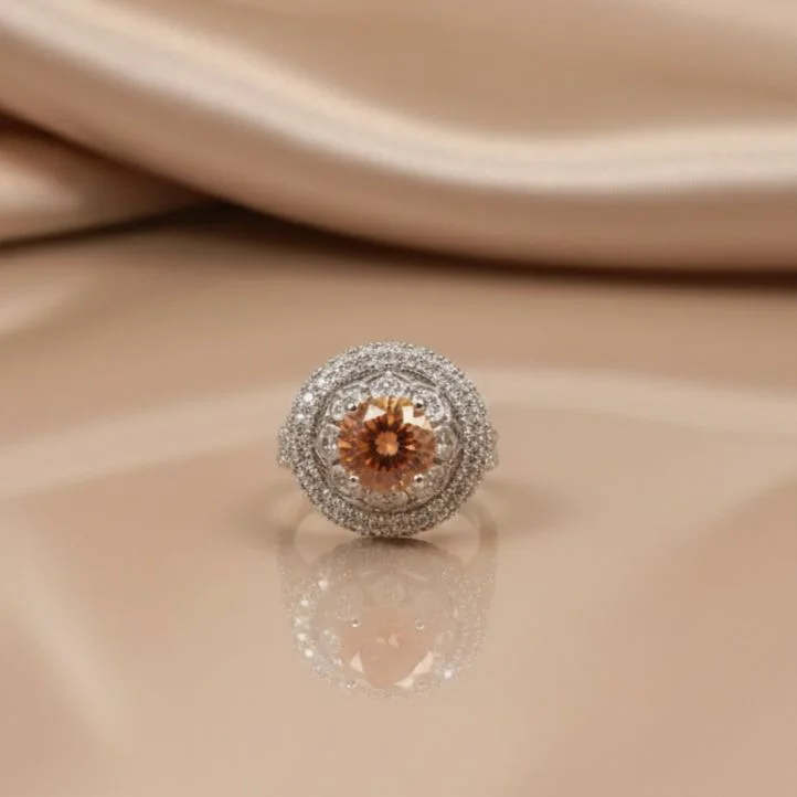 The centerpiece of this chic jewelry is a dazzling champagne stone that exudes warm, elegant brilliance.