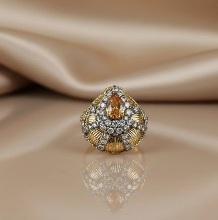 This exquisite Champagne Shell Ring (Size 17), with its opulent gold-plated frame, exudes subtle glamor.