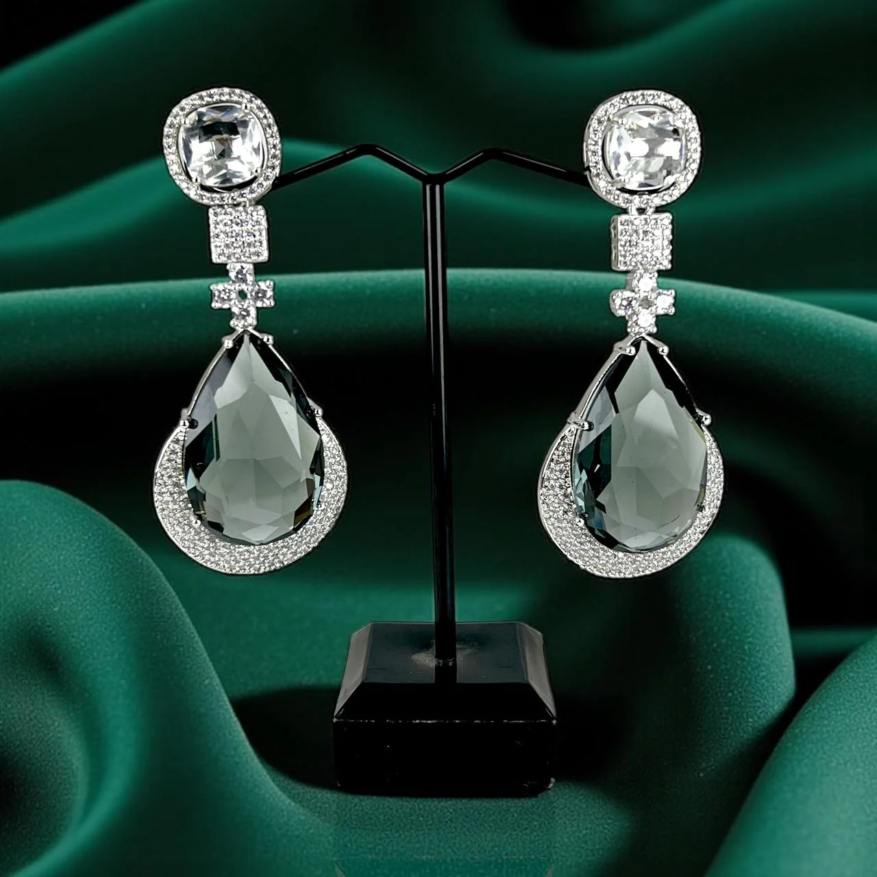 These earrings have a striking charcoal black stone in the middle, and dazzling silver American diamonds (AD) stones lend a touch of opulent brilliance.