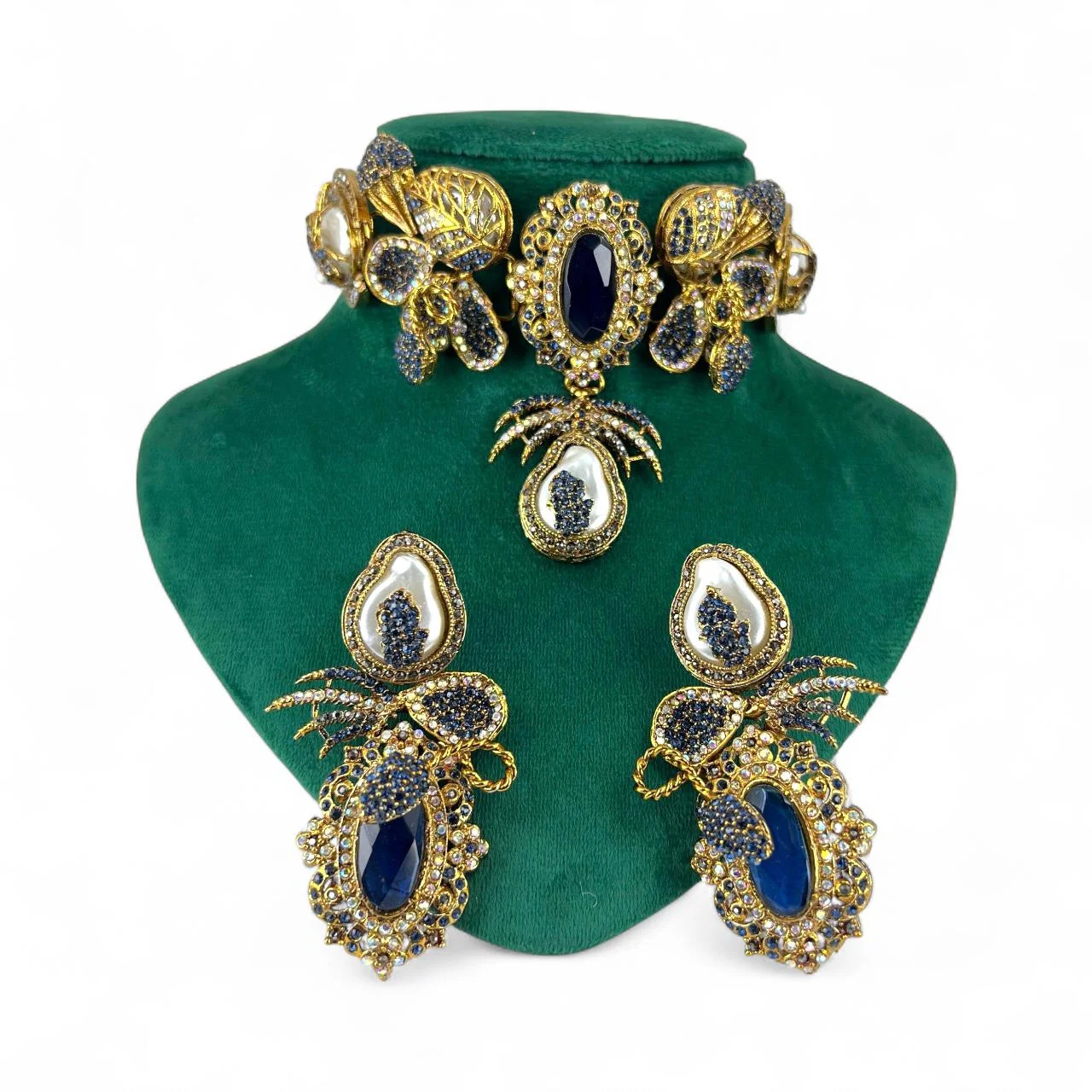 This set, which has a lovely flower-like design, is embellished with sparkling blue gemstones and brilliant stones that glitter with each motion.