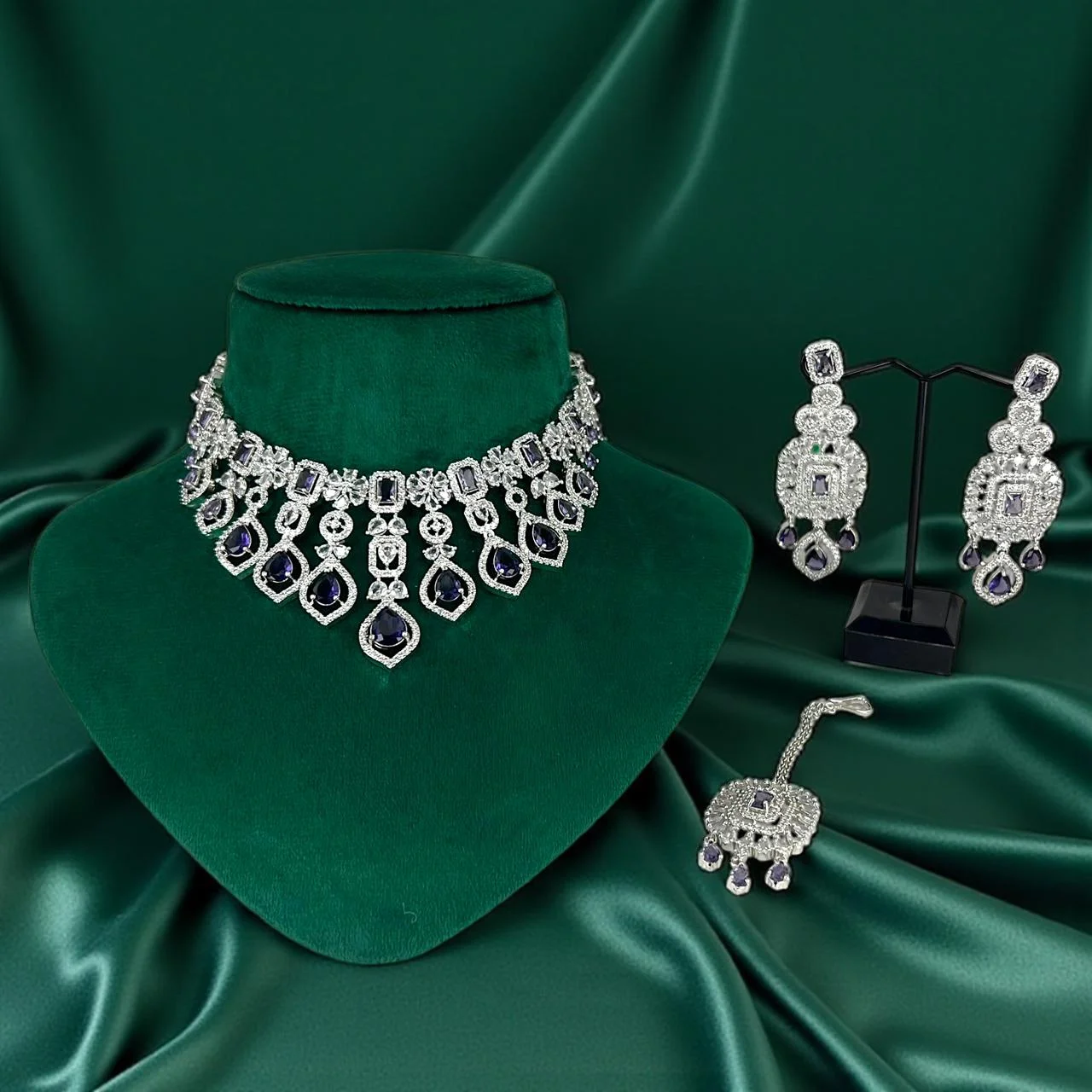 This necklace, which is set in a polished silver frame and features rich purple stones exquisitely complimented by shining silver AD stones, lends a royal touch to any attire.