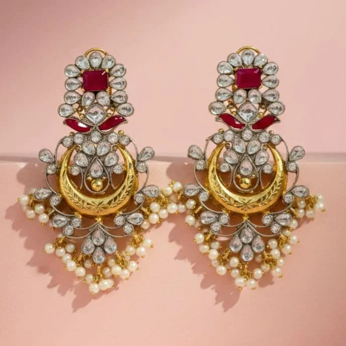 The earrings, which have rich magenta-colored stones placed in an opulent gold-plated frame, are sophisticated and lively.