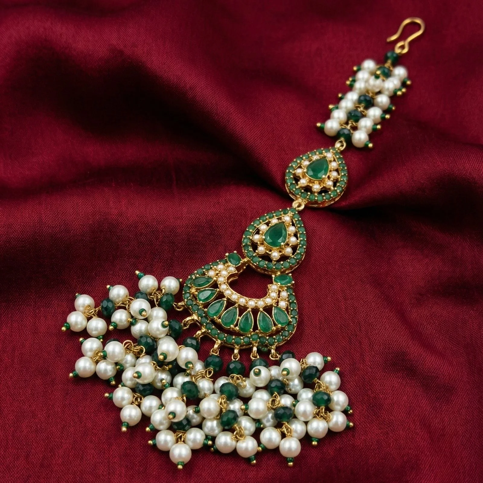The tikka has a rich and striking design thanks to its vivid green stones that are exquisitely complemented by golden gems.