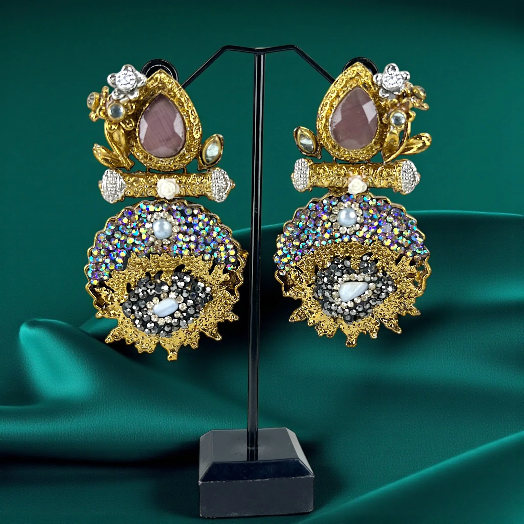 Each earring, which is adorned with glittering gemstones, catches light from all directions, producing a brilliant impact that elevates any ensemble.