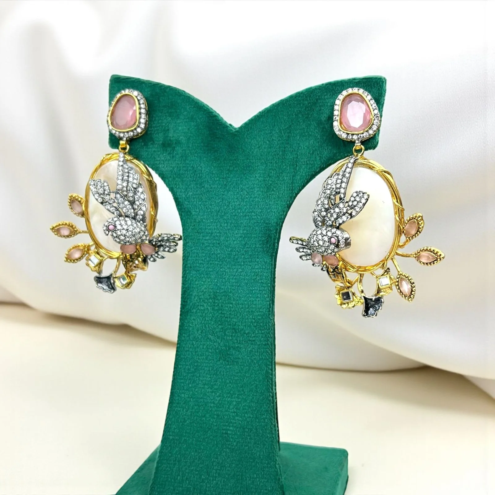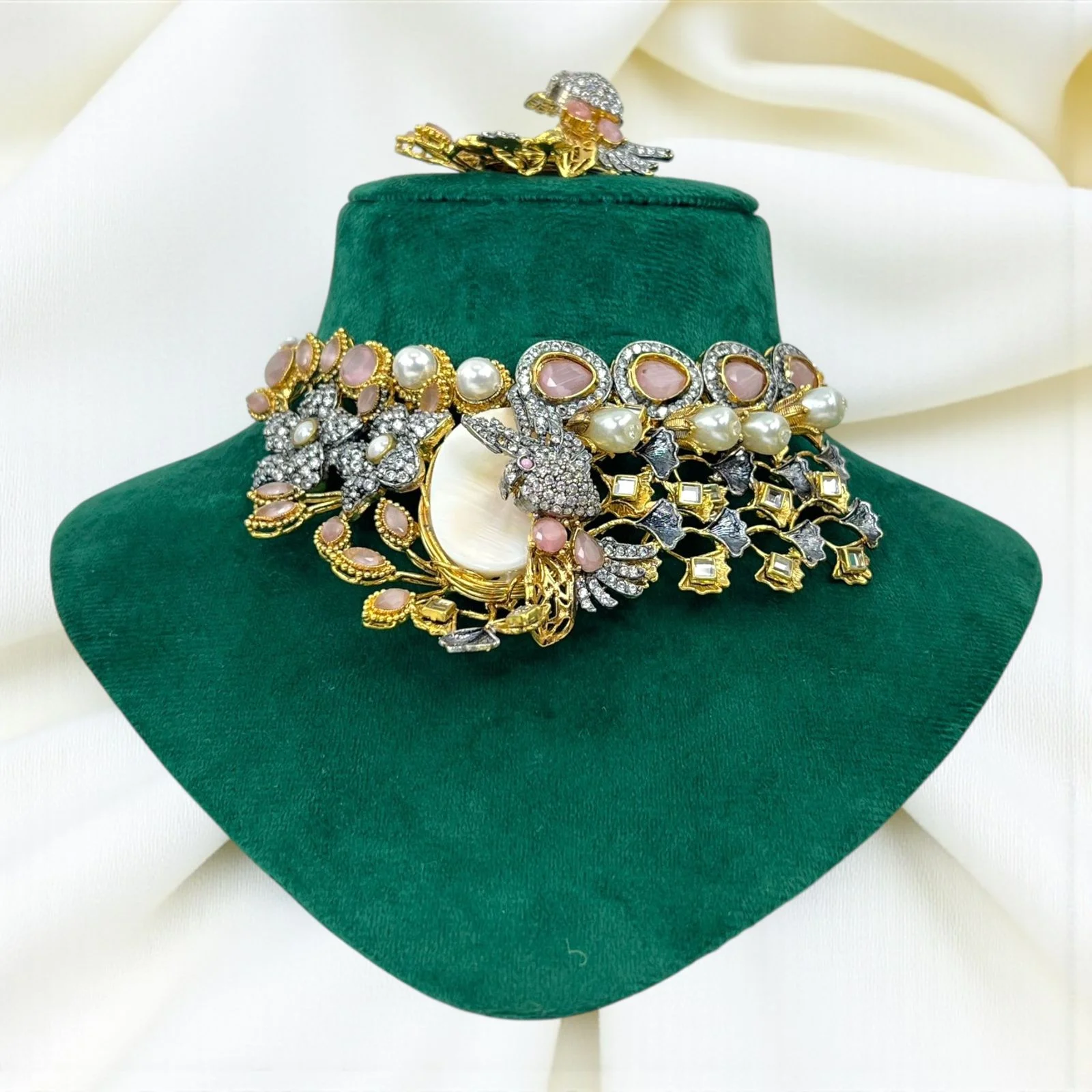 Every element of this opulent set, which is beautifully framed in rich gold plating and has a delicate harmony of blush pink and pure white tones, radiates romance and elegance.