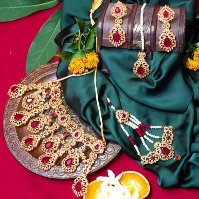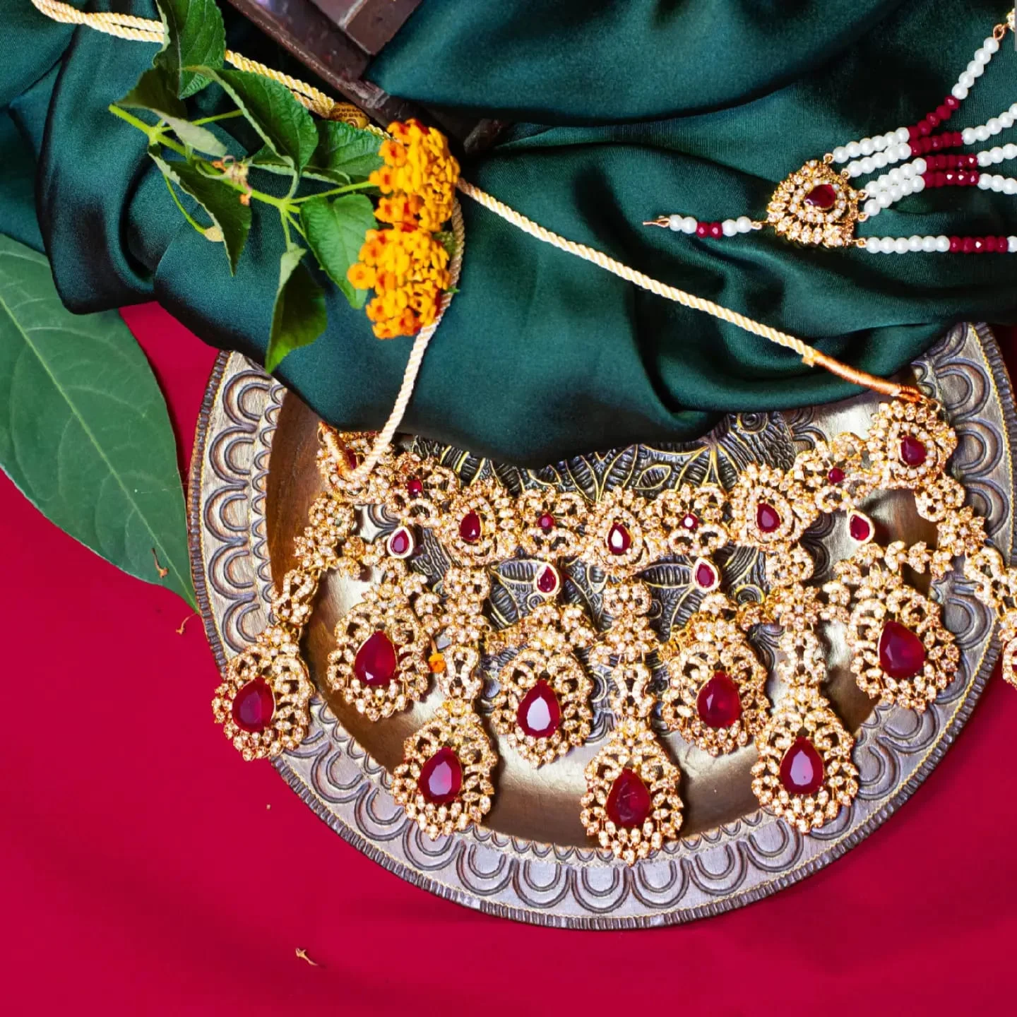 The set, which has an opulent golden designer pattern, is exquisitely adorned with ruby drop-like stones that provide a sophisticated and vibrant flash of color.