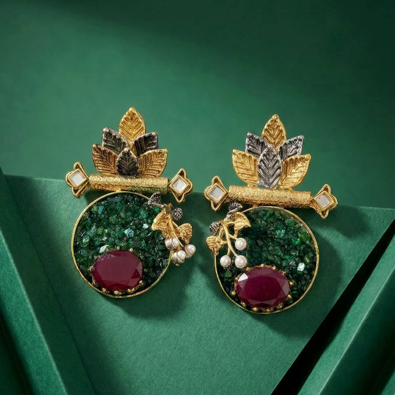 Each earring has a stunning crushed emerald stone at its center that exudes an earthy, deep elegance.