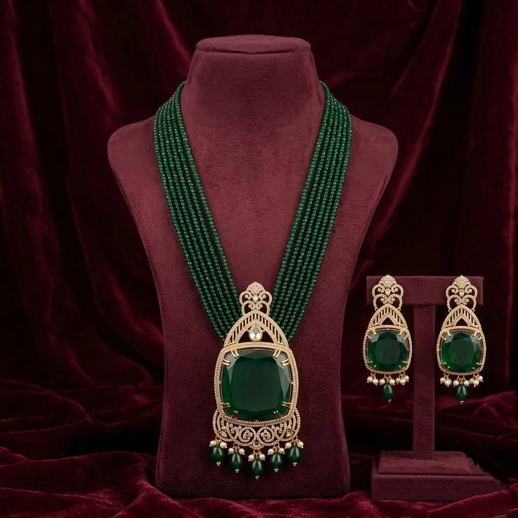 Layered emerald chokers form a beautiful and striking neckline in this elegant mala set.