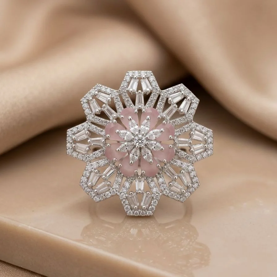 Sparkling silver zircon accents wonderfully match the delicate and feminine touch of the soft rose pink stones.