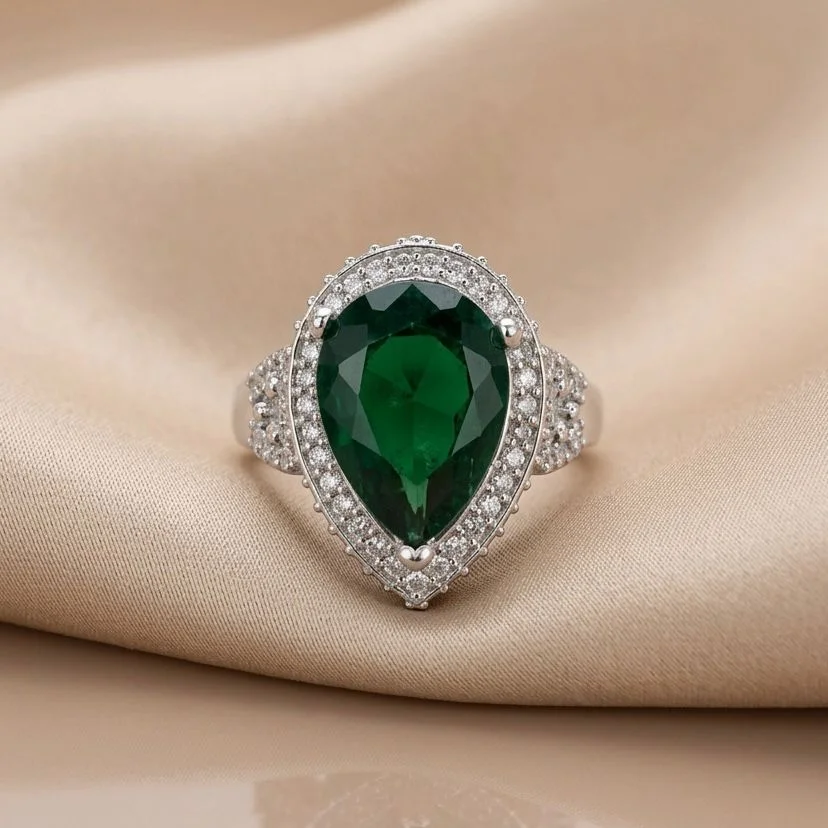 This Emerald Drop Ring, which comes in size 17 and has a sleek silver frame that radiates sophistication and elegance, will elevate your look.