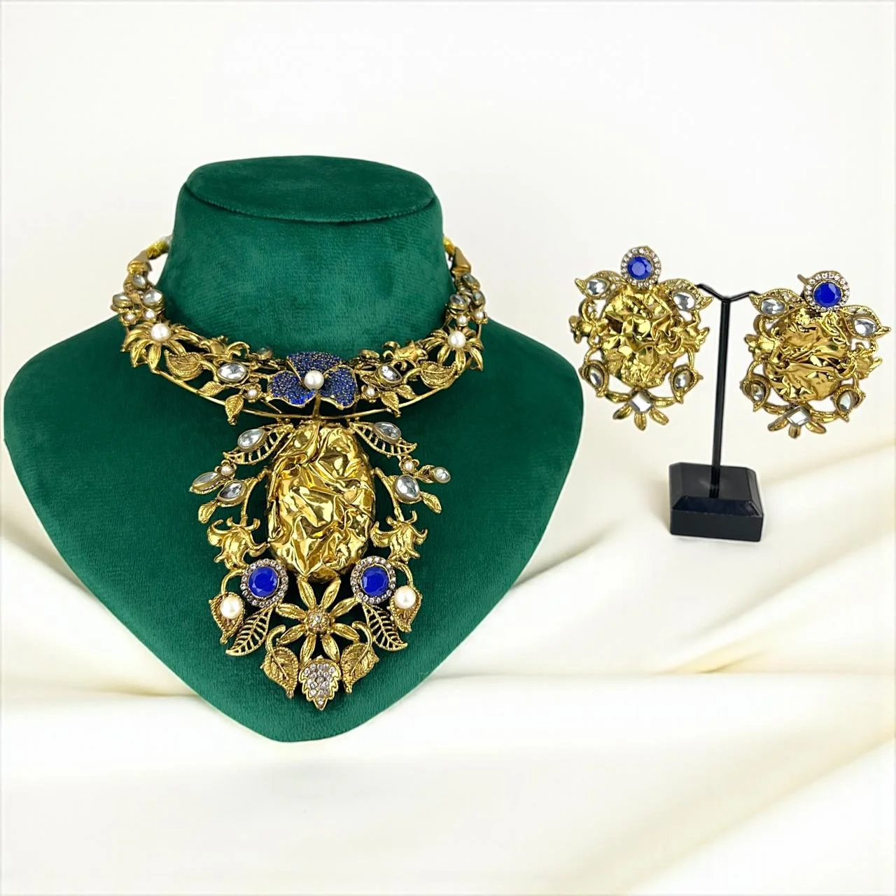 This combination, which includes matching earrings, pays homage to both traditional artistry and modern charm.