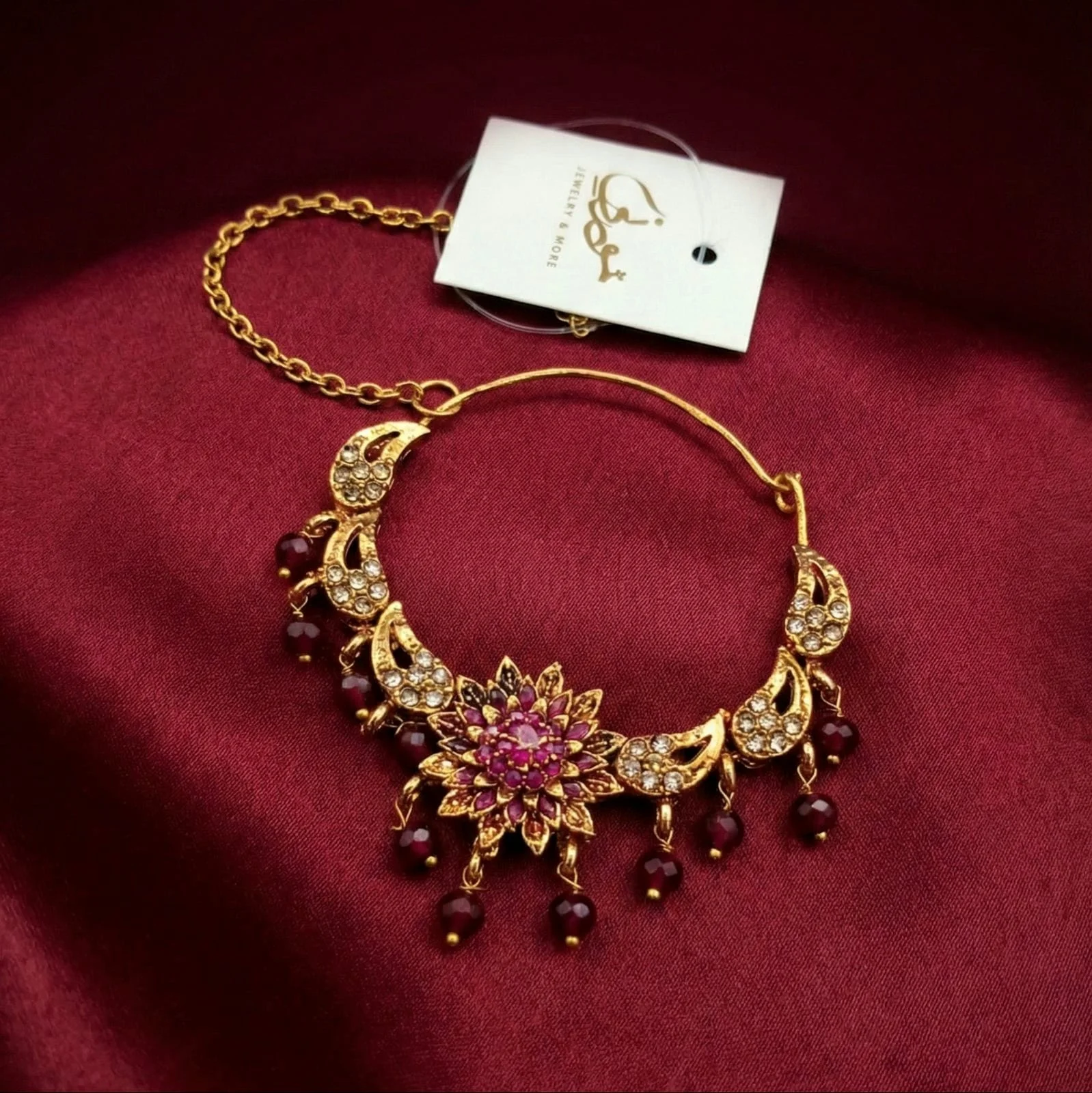 A glittering and elegant touch is added to the nath by the exquisite arrangement of champagne or magenta gems in a flowery pattern.