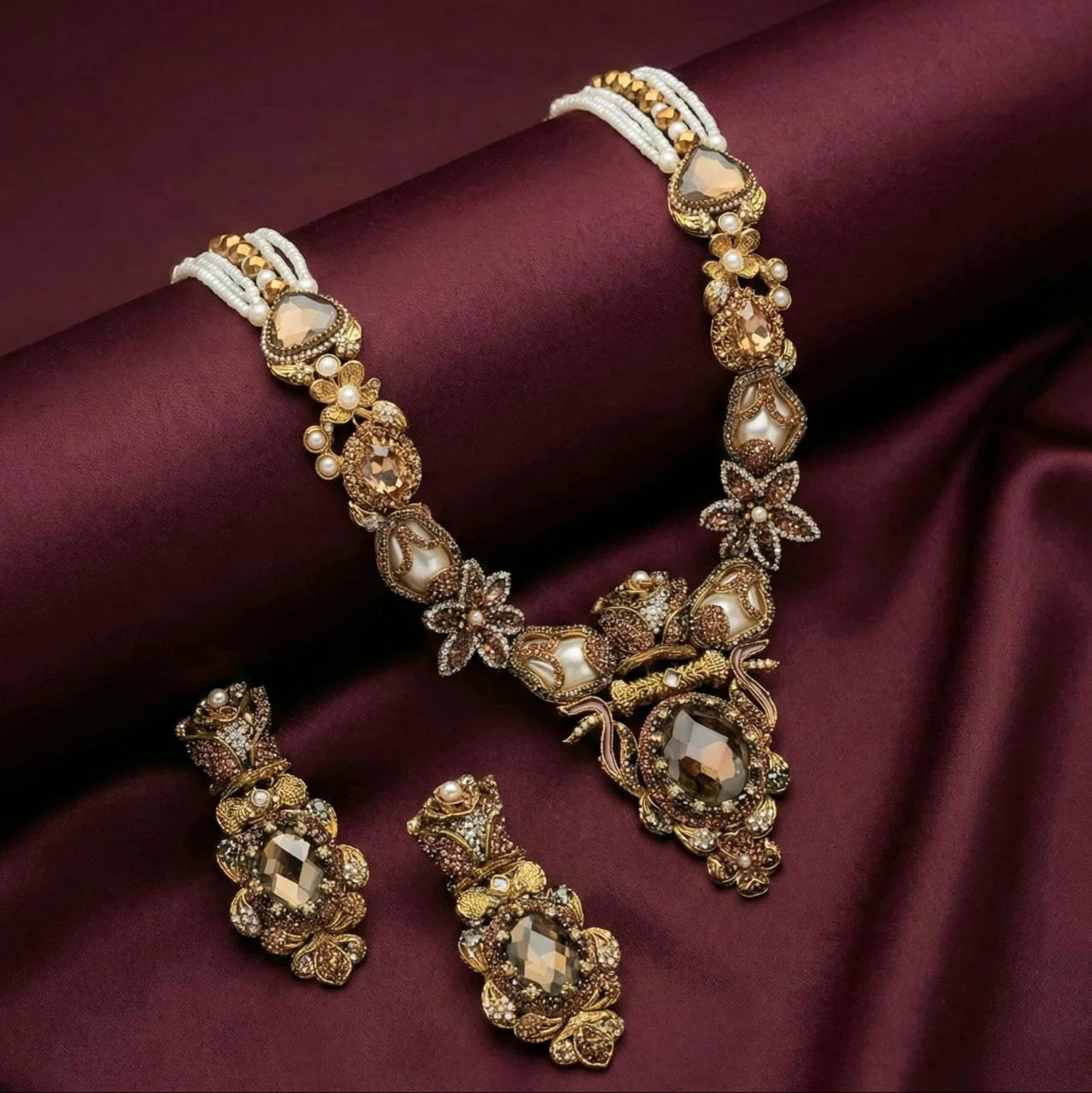 A delicate floral motif pendant accentuated with champagne stones complements the necklace's exquisite arrangement of soft champagne and white stones in a floral-inspired design.