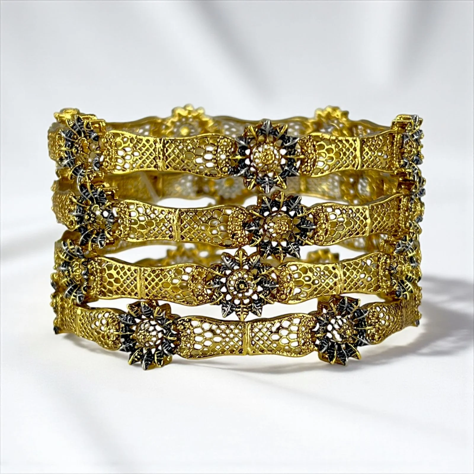 Each bangle’s elaborate golden floral patterns are exquisitely accentuated with delicate silver and black tones, which provide depth and a dramatic contrast to the opulent golden basis.