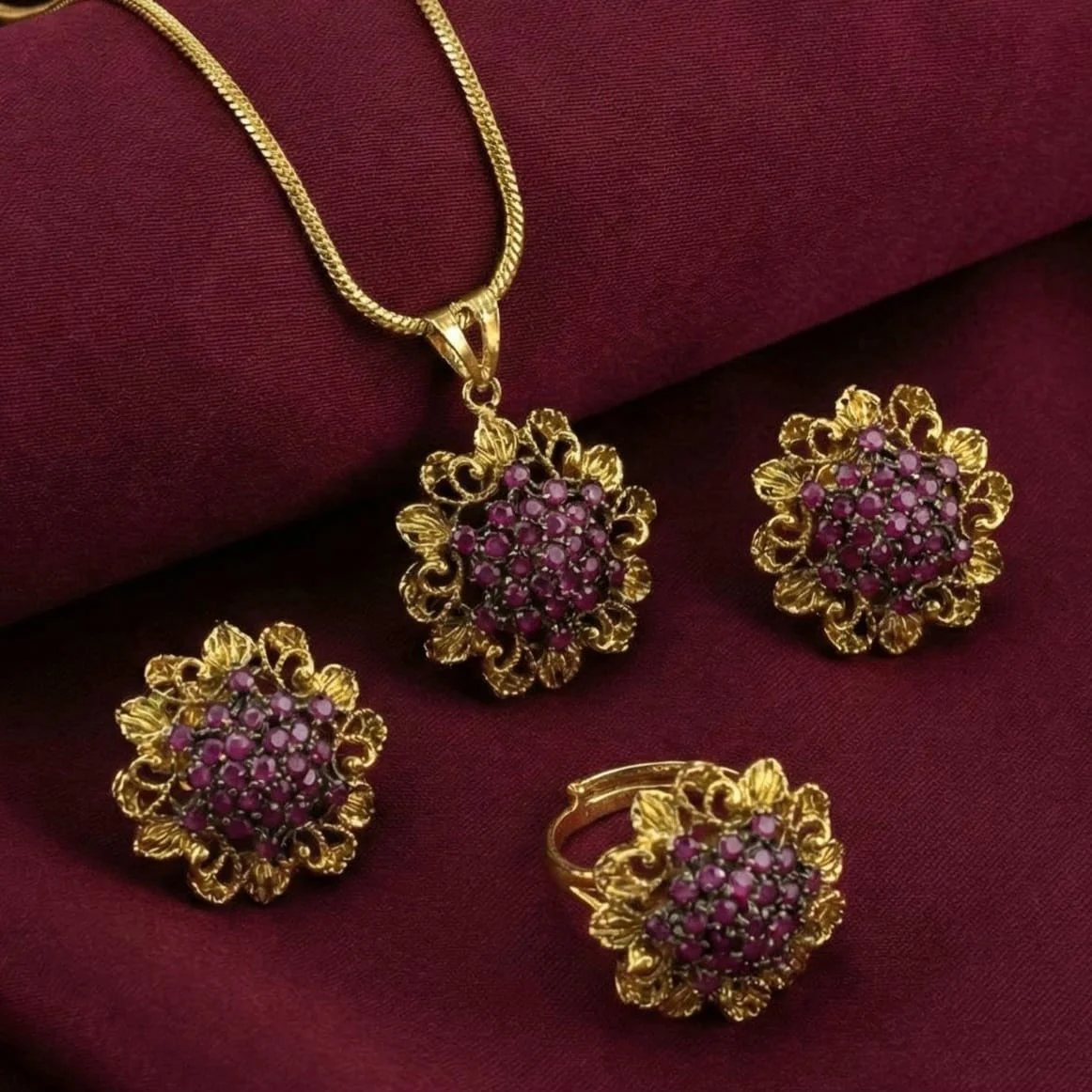 Rich magenta gems embellish this magnificent set's elegant flower design, giving it a striking yet feminine charm.