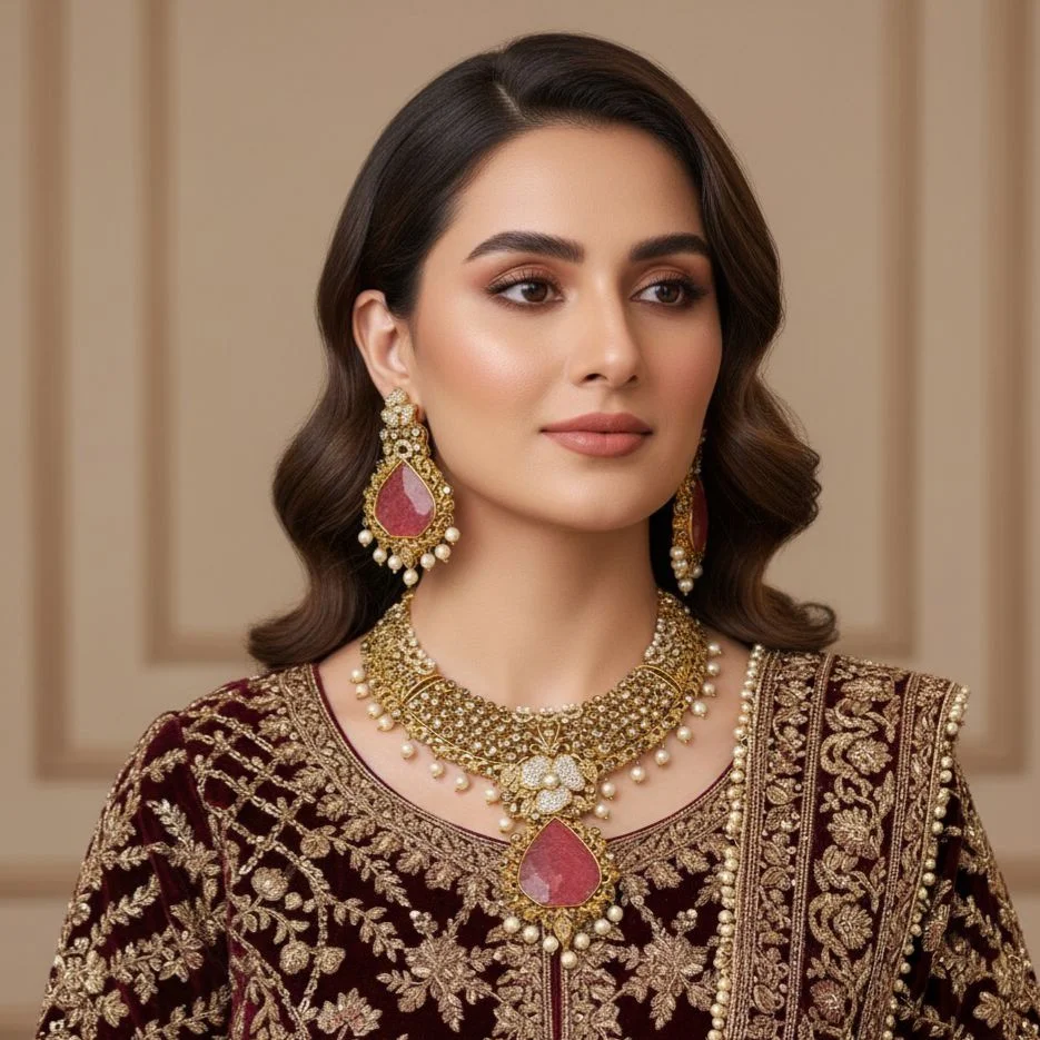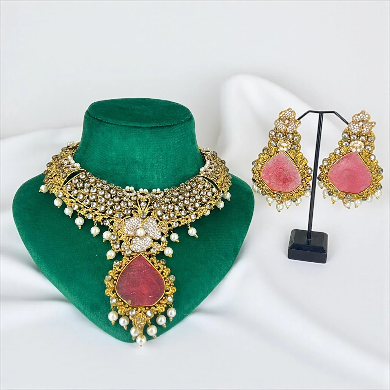 With its elegant golden Hasli-style neckline that radiates timeless charm, this gorgeous floral pink jewelry set will elevate your elegance.