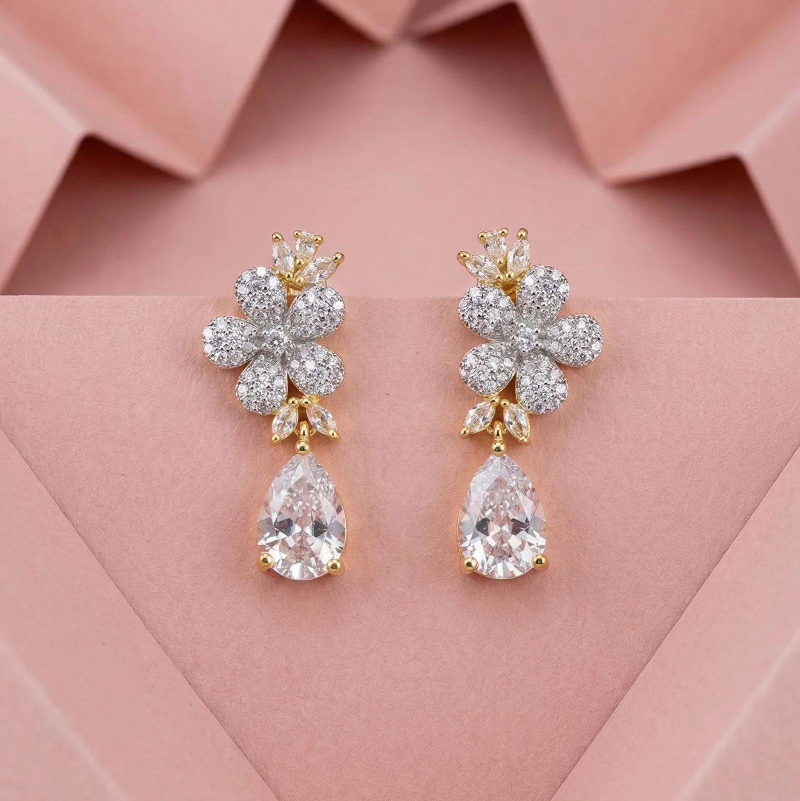 White floral ear studs with a polished golden frame and a sophisticated floral motif.
