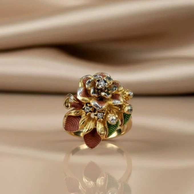 The ring’s multi-shine embellishments and exquisite 3D floral motif with delicate foliage motifs catch the light beautifully from all directions.