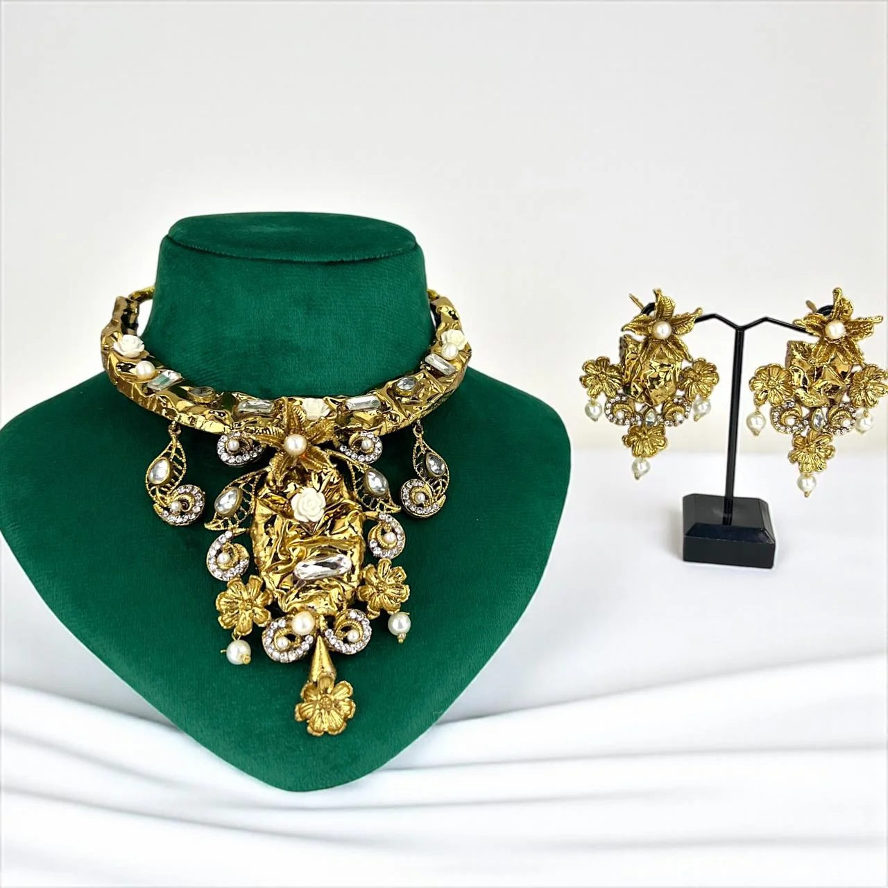 Its focal point is a gorgeously created golden pendant that is embellished with elaborate flower motifs that honor classic workmanship.