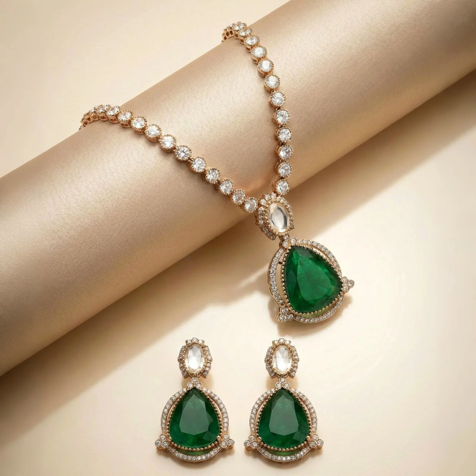 Sparkling white stones adorn the neckline of the focal pendant, which has a dazzling green stone.