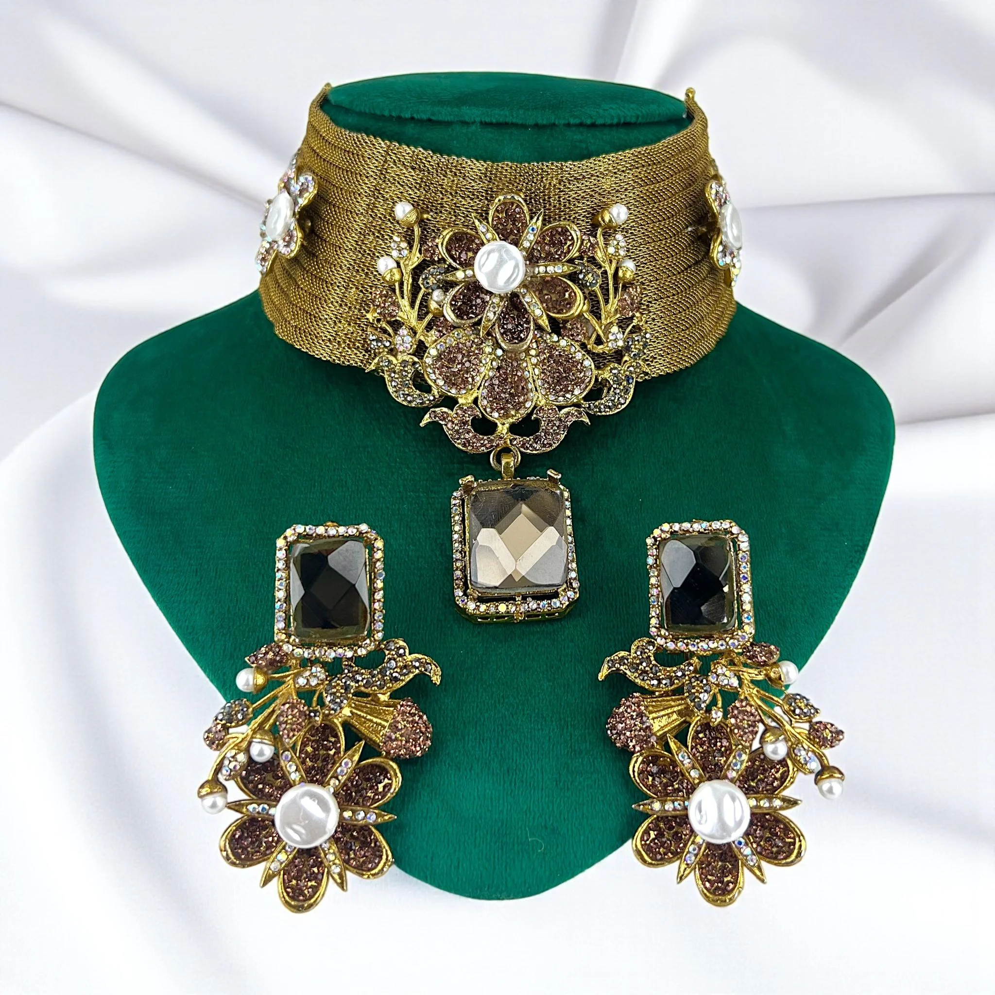 Sparkling champagne stones add a delicate, opulent shine, while the neckline, adorned with rich brown gemstones, radiates warmth and sophistication.