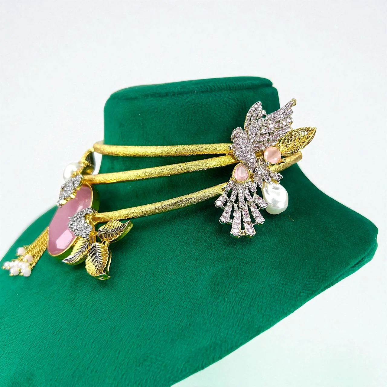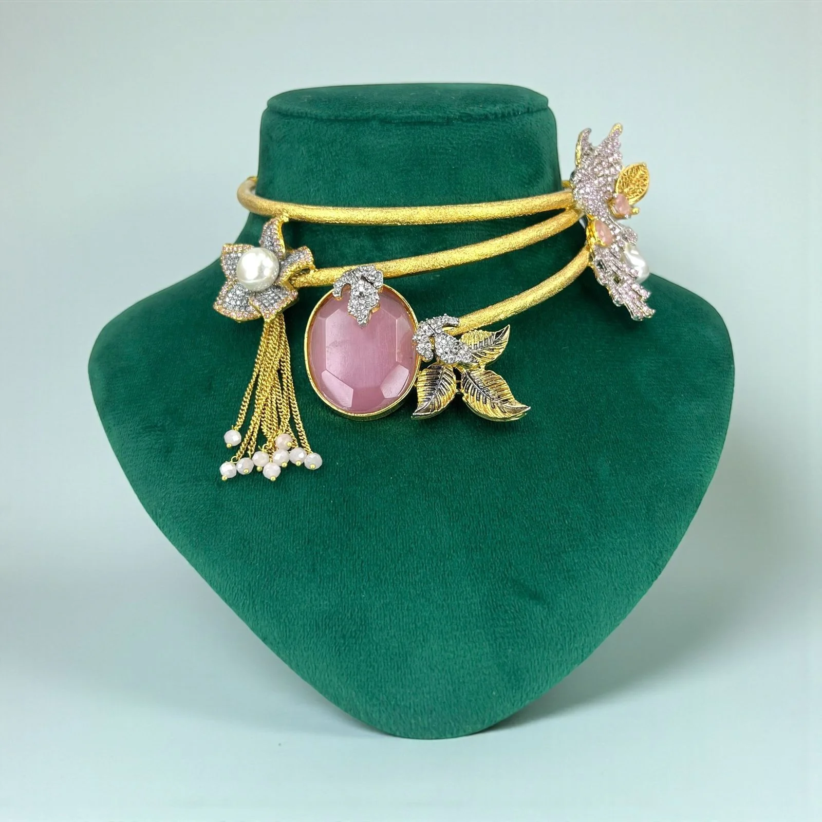 The tiny pink stones and floral-inspired pattern of this set, which is crafted on a golden frame with a rich gold-plated gloss, radiate an opulent brilliance.