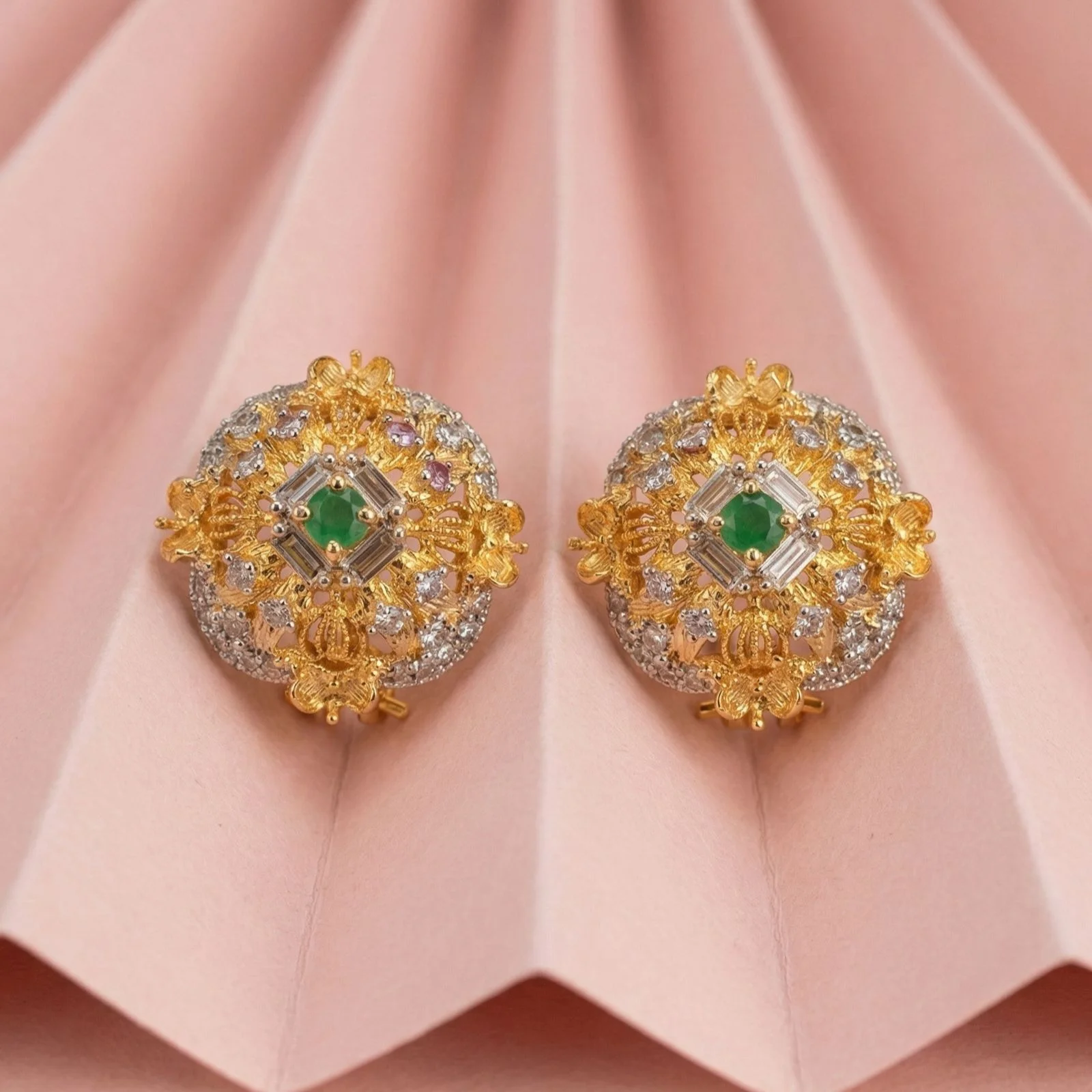 The lovely gold-plated frame of these green ear studs is adorned with a delicate floral design for a subtle yet sophisticated appearance.