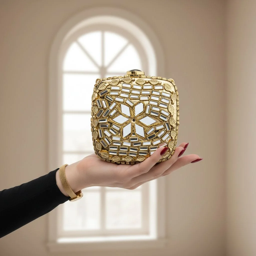 This clutch, which has a timeless square design, has a sturdy golden frame that gives it a rich, opulent appearance.