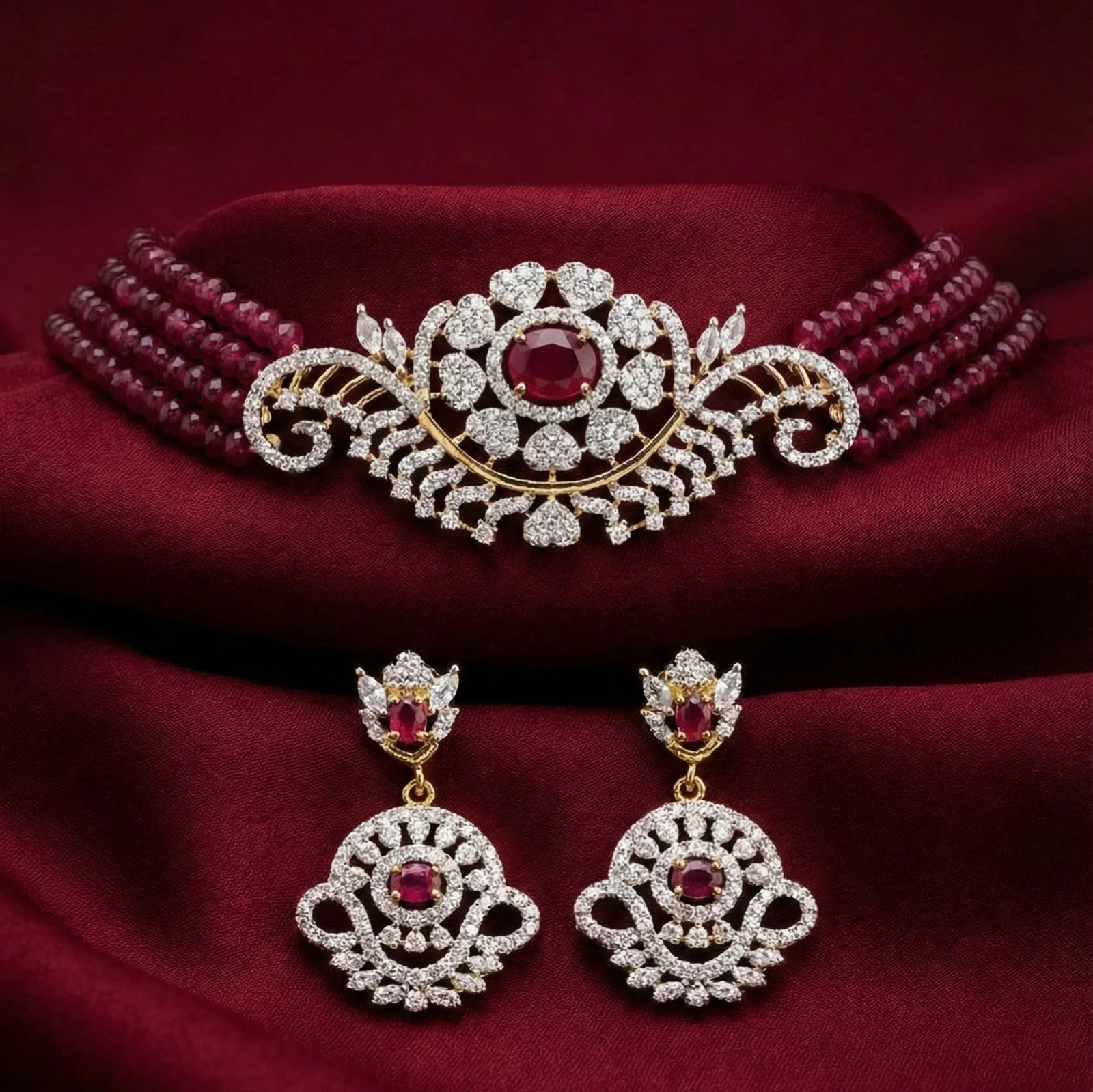 With its deep maroon choker layers that sit exquisitely around the throat, this sophisticated Heart Choker Set makes a striking statement.