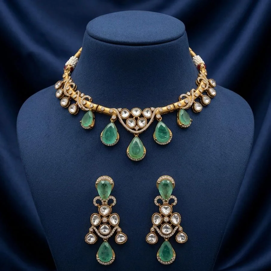 This exquisite set has a gorgeous golden neckline that is embellished with vivid jade green stones.