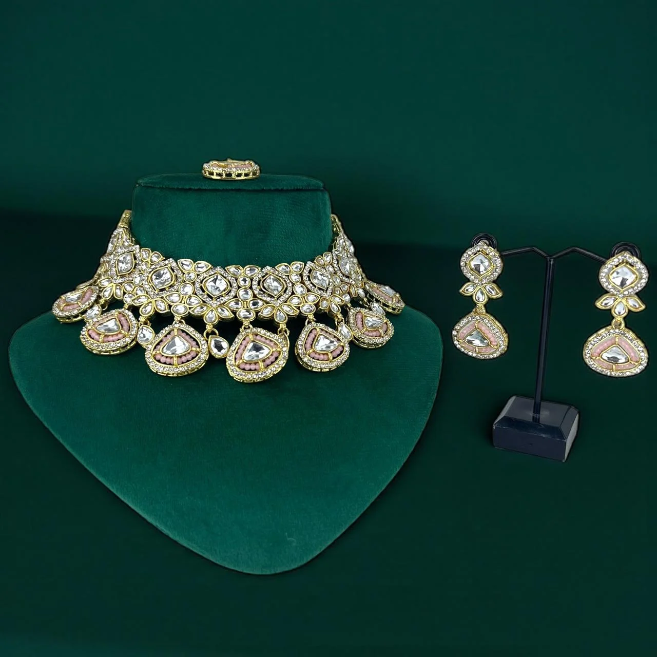 This exquisite Kundan Pink Set, which features brilliant white Kundan beads set in a rich golden frame, exudes elegance.