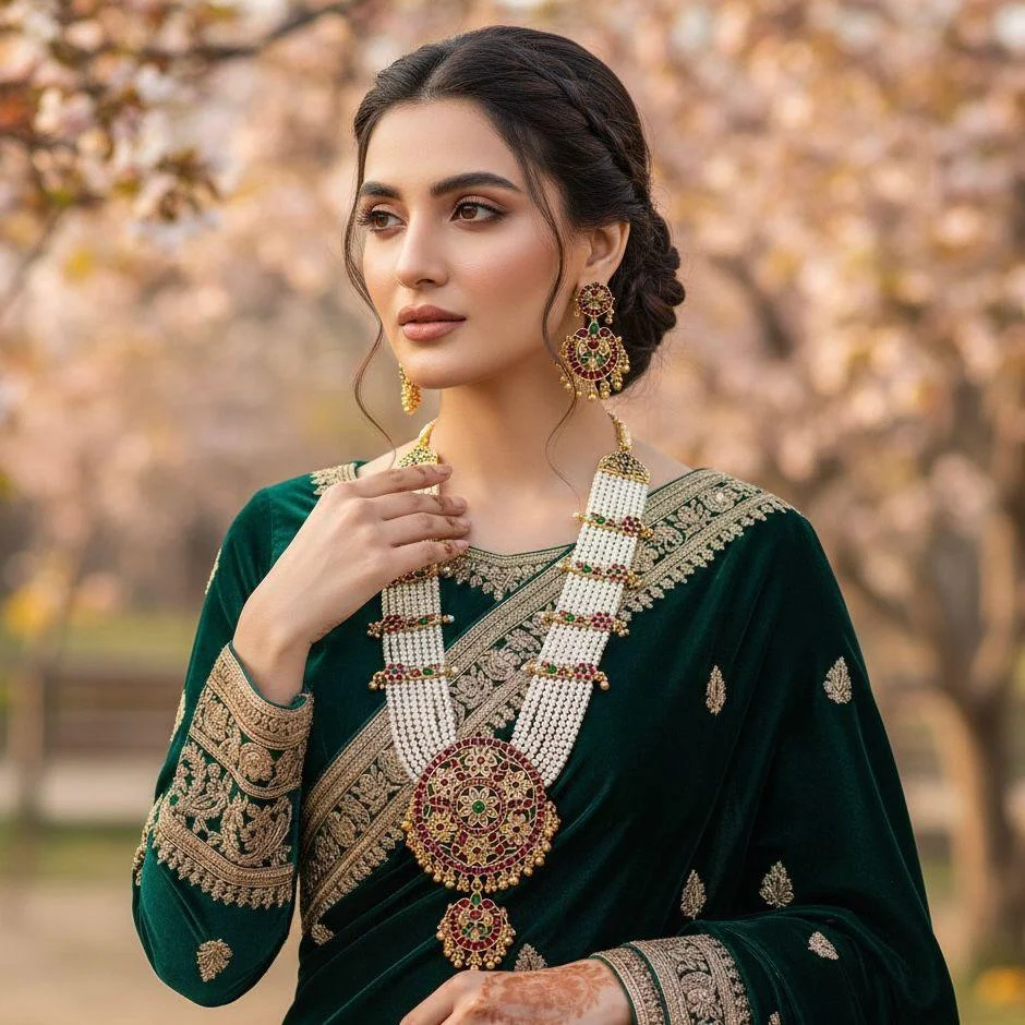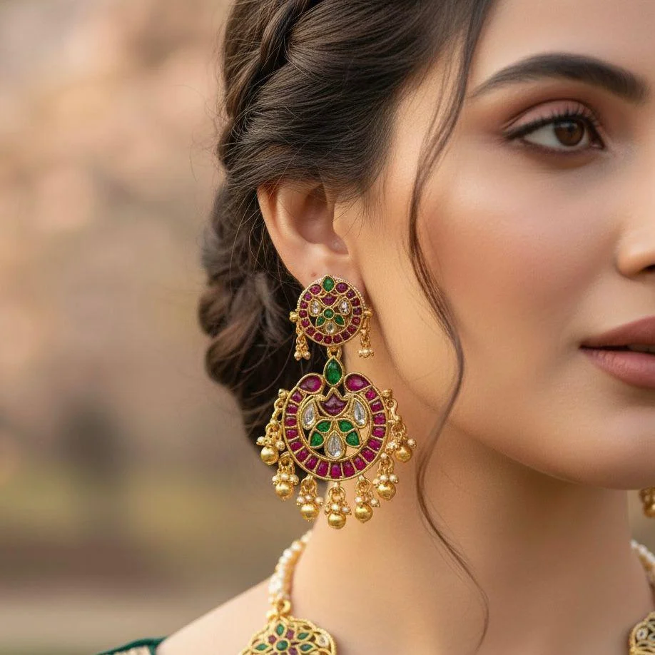 A chic Indian pendant with a striking pink or green stone that instantly draws attention is at the center of the design.