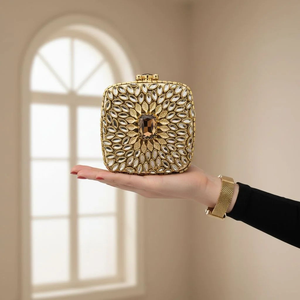 A gorgeous little golden clutch that will add a touch of royalty to your outfit.