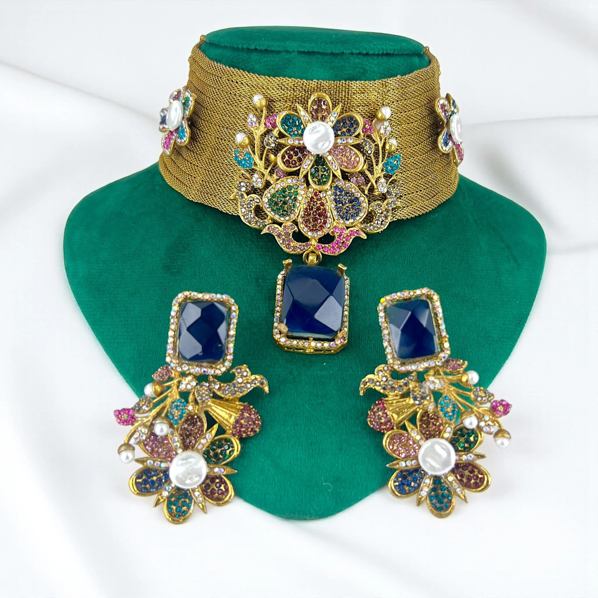 Rich blue stones lend depth, brilliance, and a royal touch to the set, which is adorned with a brilliant assortment of multicolored gemstones.