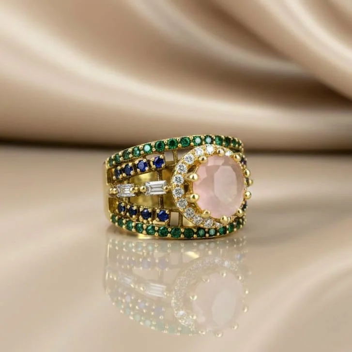 Several pink stones cover this striking ring, giving it a lively and endearing appearance.