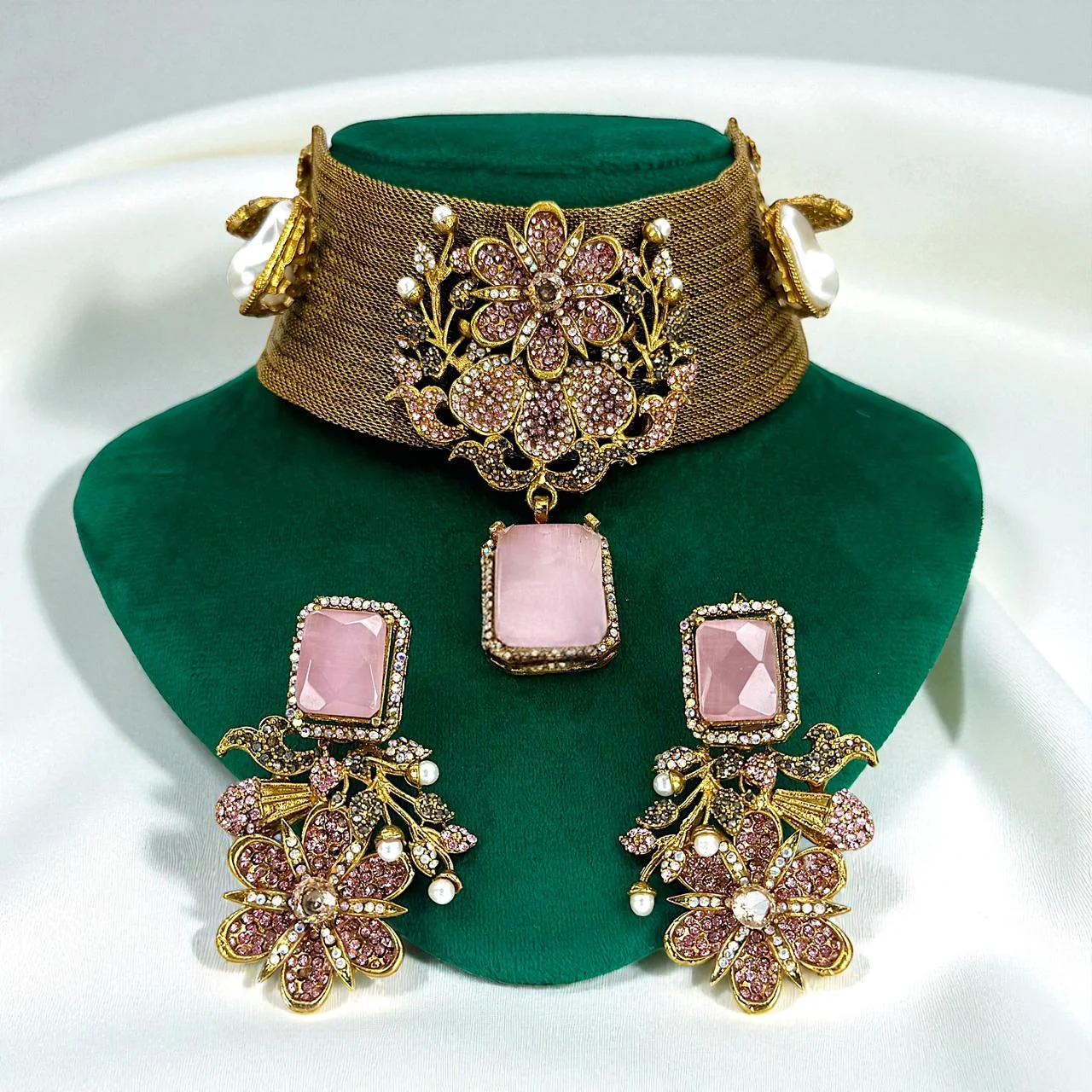 This gorgeous designer set is embellished with beautiful pink jewels that provide a romantic, feminine charm, and it features a radiant golden Maharani-style neckline.