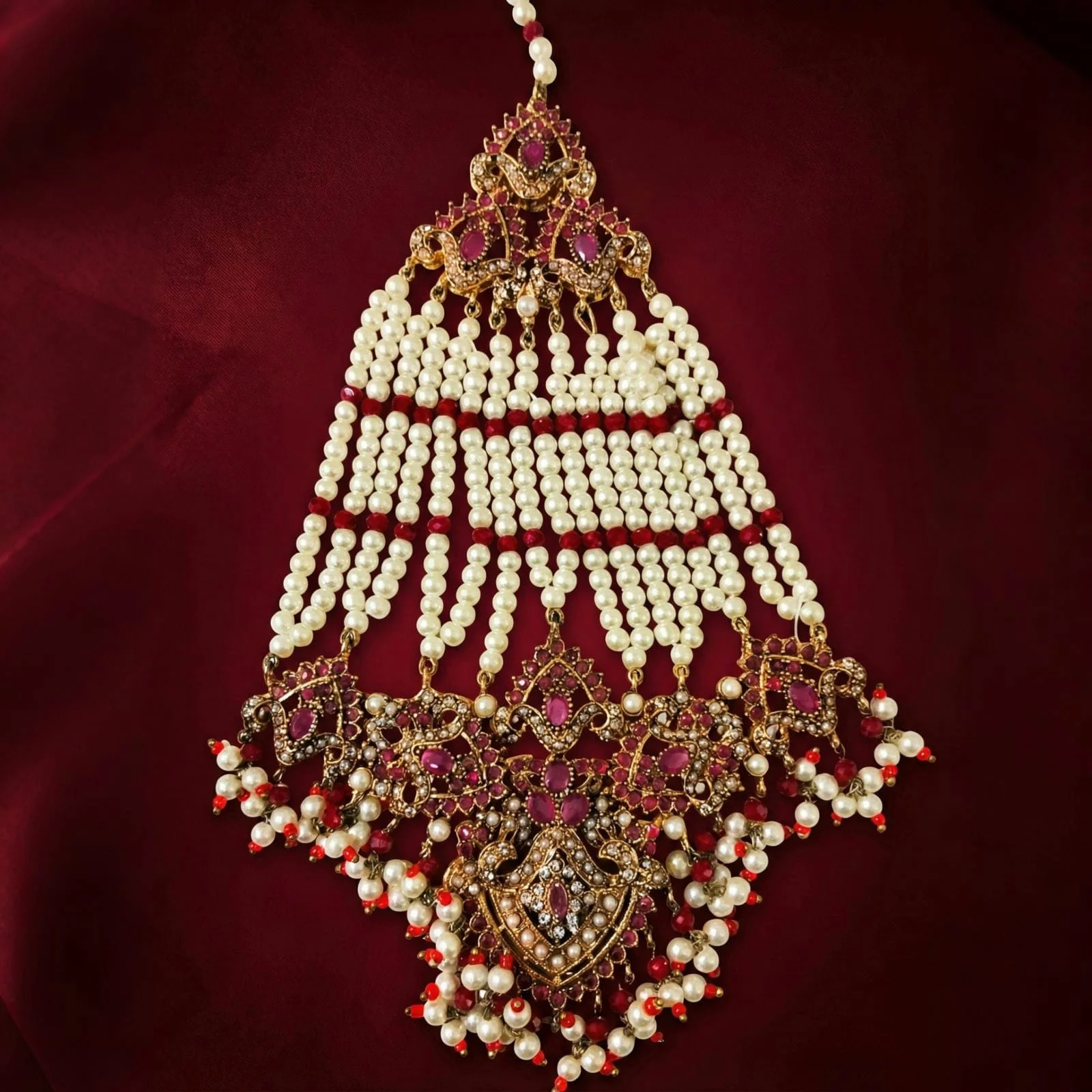 This jhoomar combines traditional workmanship with a striking, opulent color scheme, making it ideal for brides, wedding celebrations, and special occasions.
