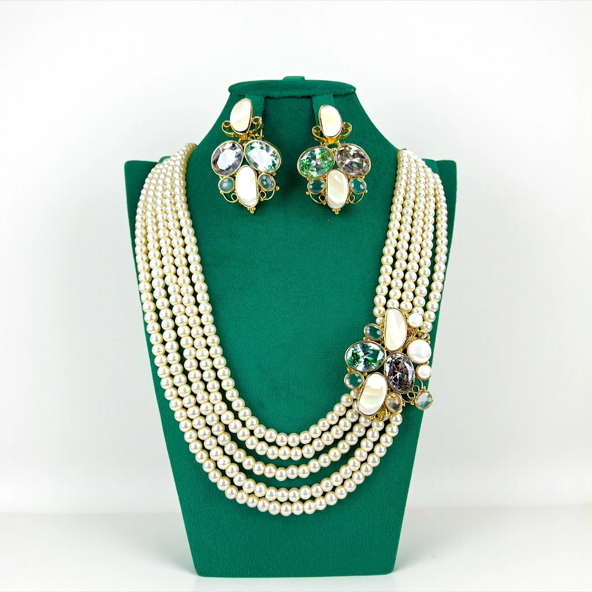 With several strands of brilliant white pearls that drape exquisitely for a rich, layered effect, this classic Pearl Layered Mala Set will add elegance to any ensemble.