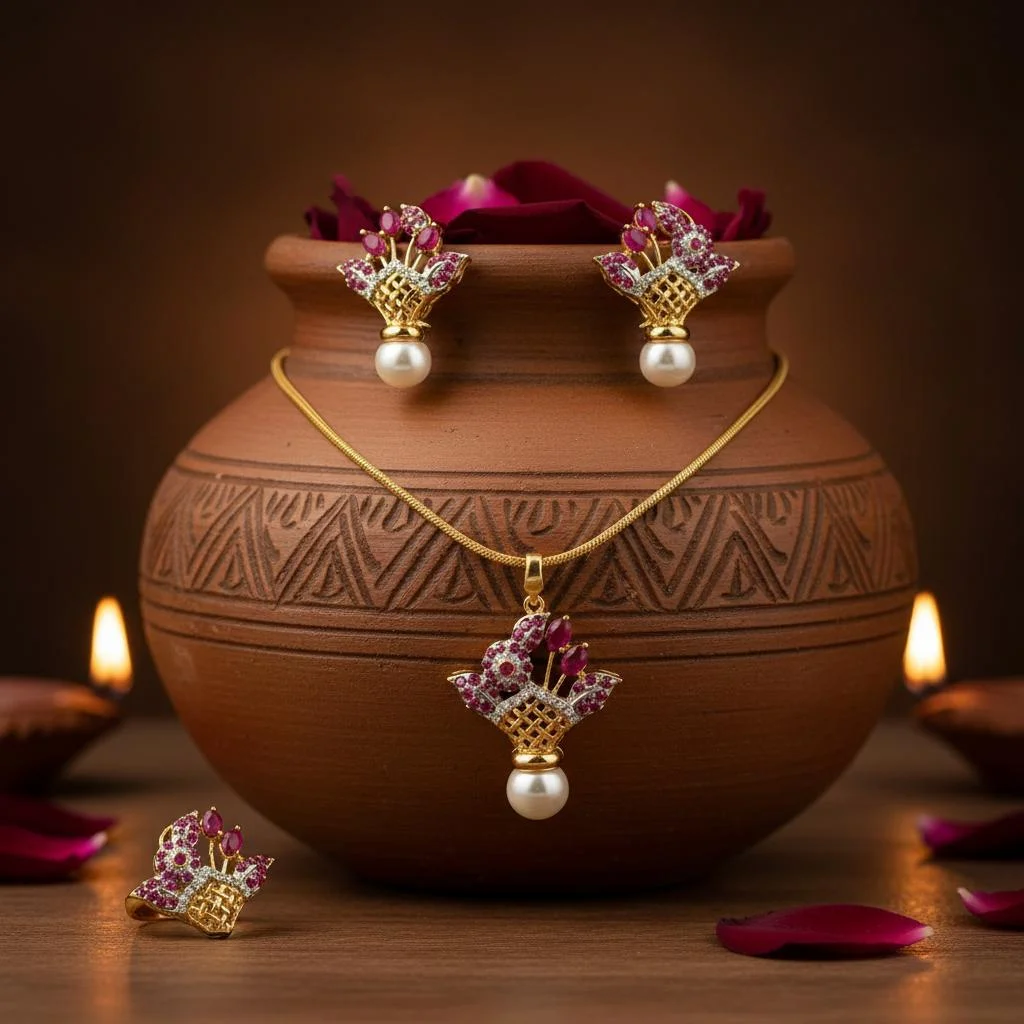 With its beautiful branched pattern and high-quality gold-plated gloss, our elegant Pearl Pink Combo Set will accentuate your beauty.