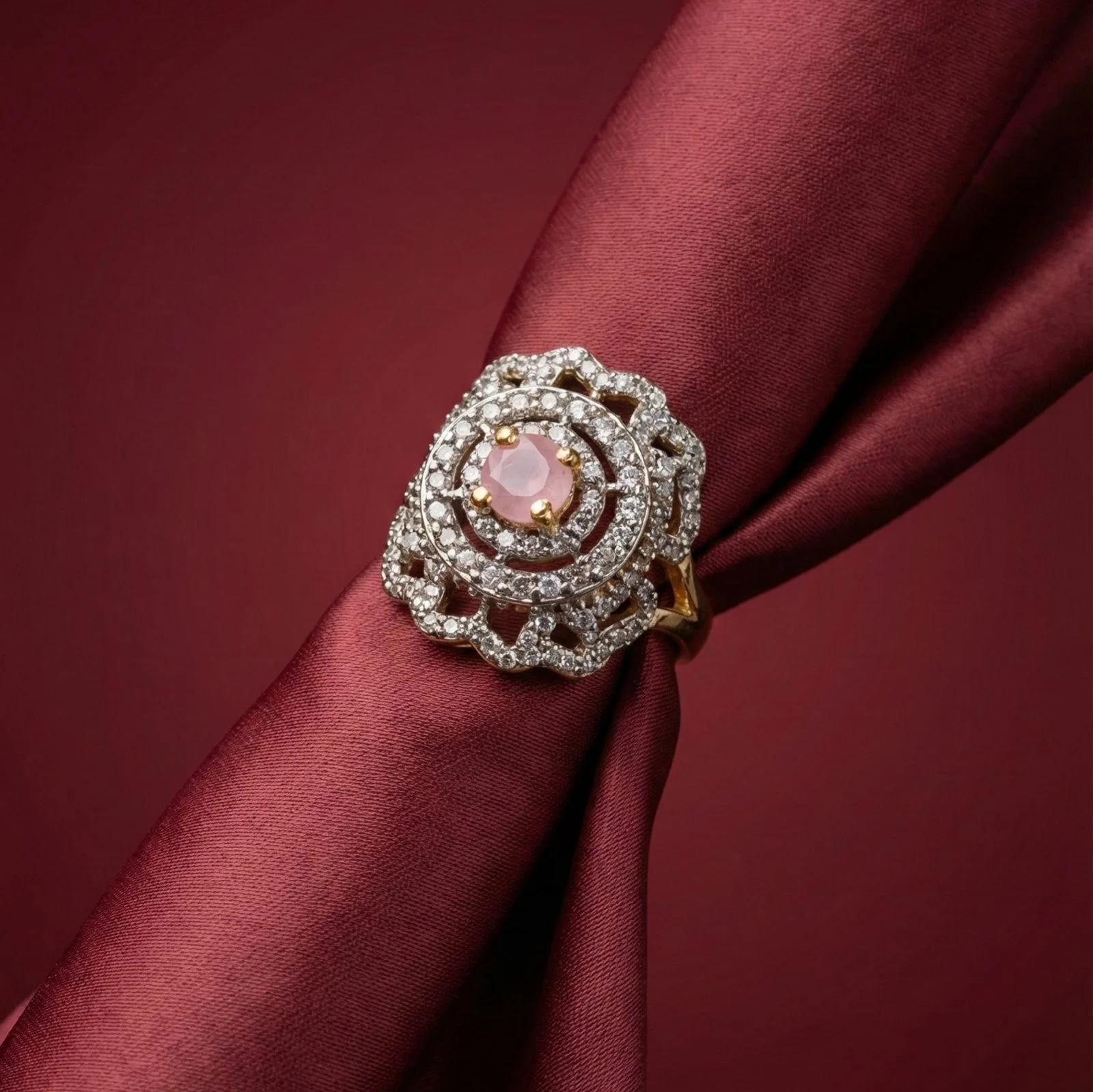 The ring features a lovely pink stone in the middle, which is accentuated by a crown-style design with shimmering silver zirconium stones.