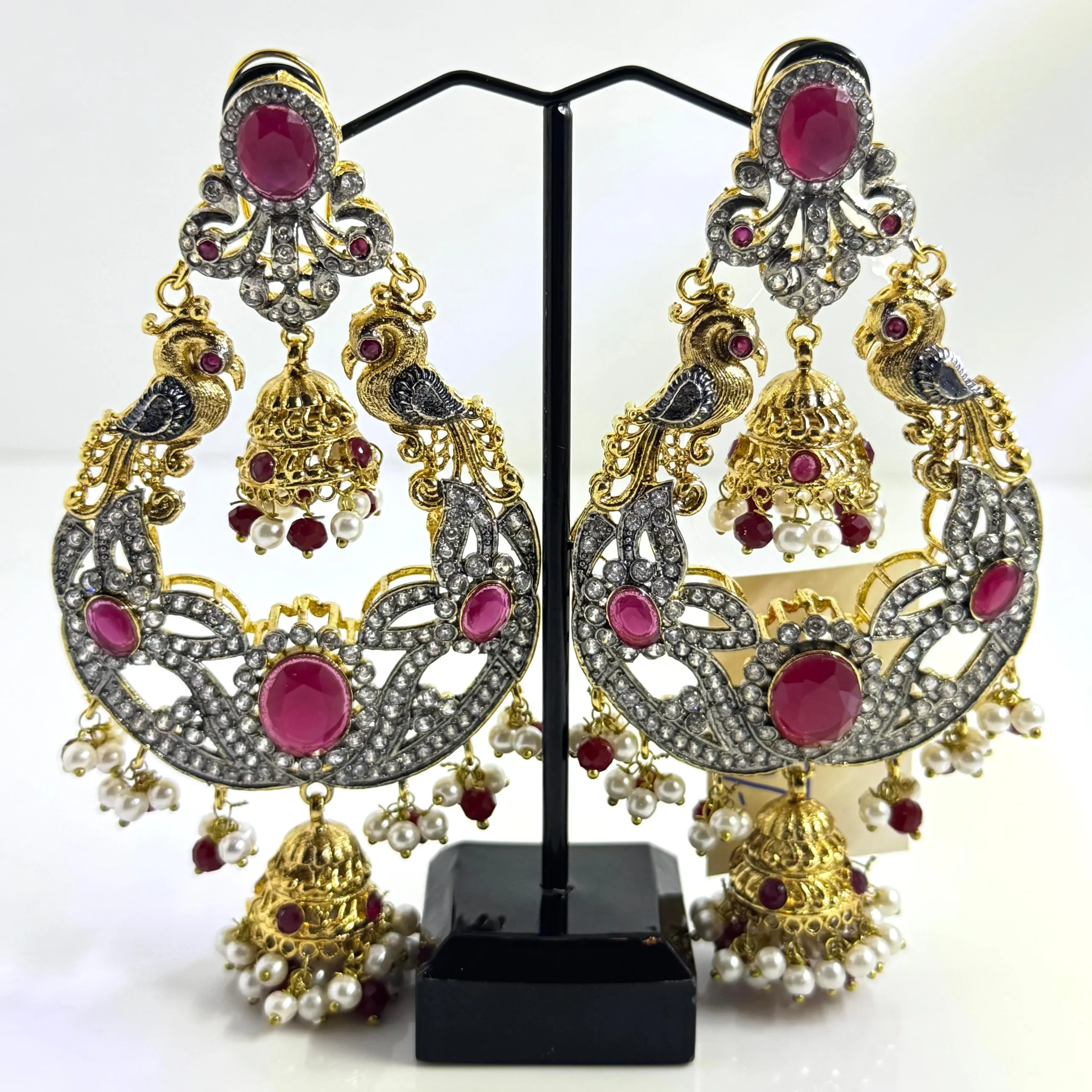 These exquisitely made earrings have a traditional jhumki-style design that is enhanced by a rich gold-plated frame and sparkling pink stones that provide a feminine and vibrant splash of color.